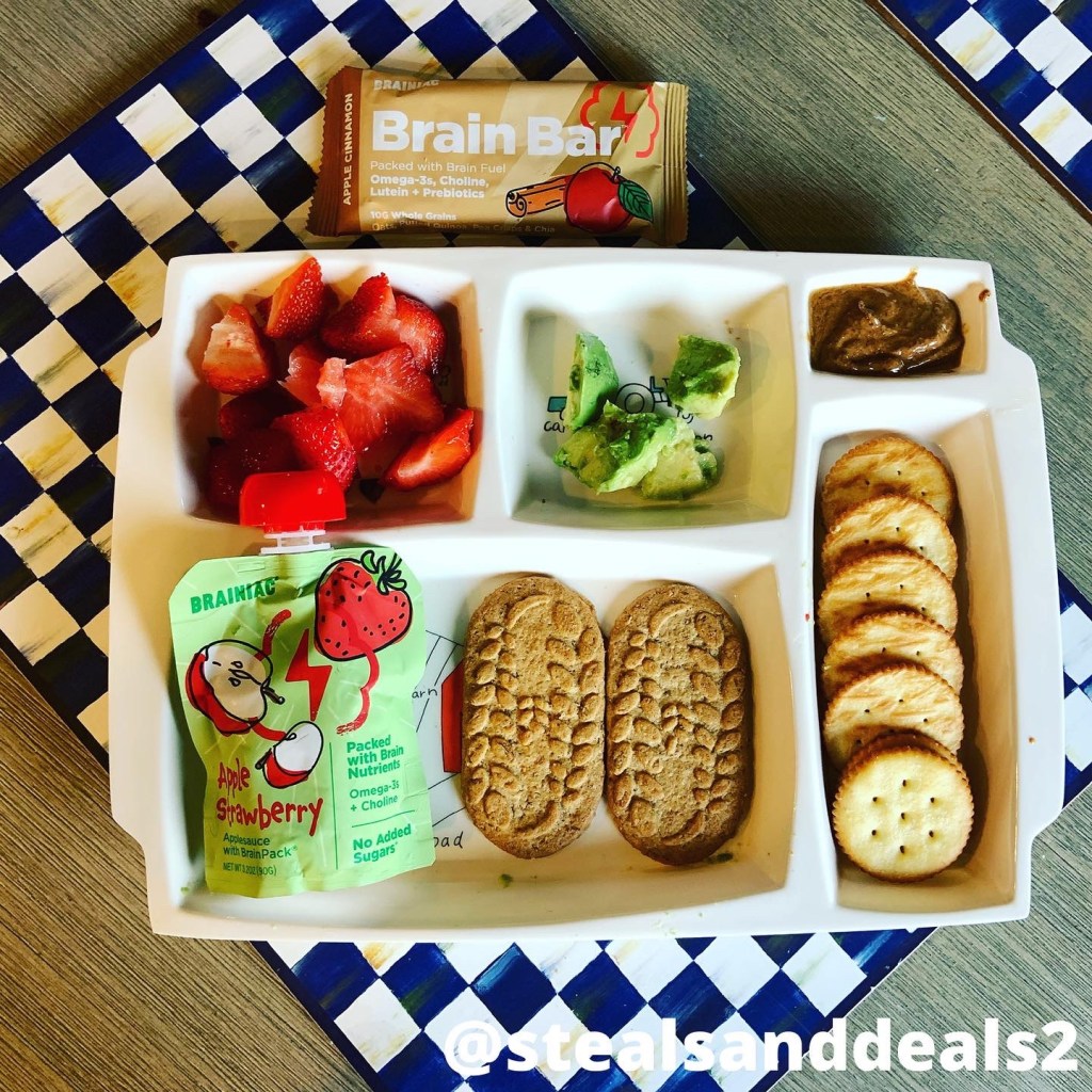 This platter features @brainiackids applesauce squeezers, brain butter and brain bars! Which all contain omega 3, DHA to help develop and strengthen your brain!