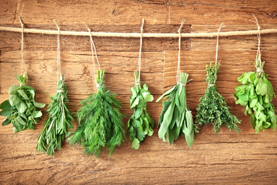 In small bunches, tie some twine or jute cord around the base of the stems. Hang your herbs in a dark, cool and dry room. If you do not have a dark room available, wrap your herbs in newspaper or a paper back to protect them from the light.